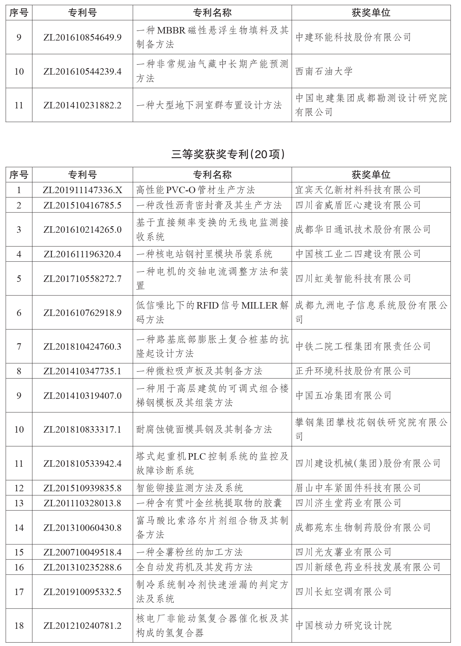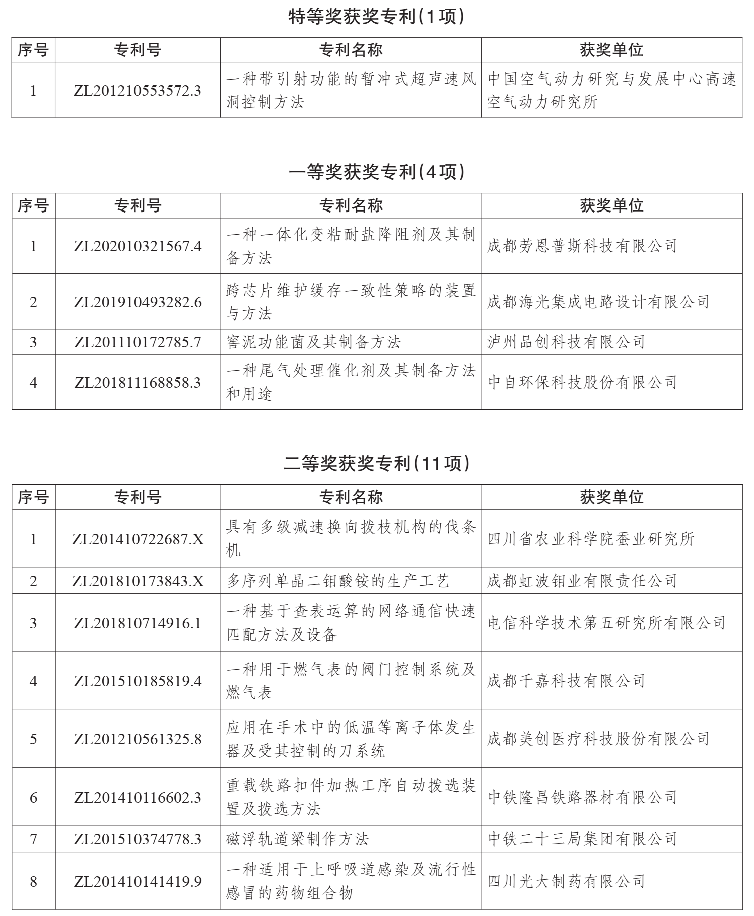 为深入贯彻落实习近平总书记关于知识产权工作的重要论述和习近平总书记来川视察重要指示精神,全面推动省第十二次党代会精神落地落实,加快建设“国家引领型知识产权强省”,根据《四川省专利实施与产业化激励办法》,经四川省专利实施与产业化奖(以下简称四川专利奖)评审委员会评审,省政府决定授予“一种带引射功能的暂冲式超声速风洞控制方法”1项专利四川专利奖特等奖,授予“一种一体化变粘耐盐降阻剂及其制备方法”等4项专利四川专利奖一等奖,授予“具有多级减速换向拨枝机构的伐条机”等11项专利四川专利奖二等奖,授予“高性能PVC-O管材生产方法”等20项专利四川专利奖三等奖,授予“一种混凝土墙体及底板渗水裂缝的修复方法”等30项专利四川专利奖创新创业奖。