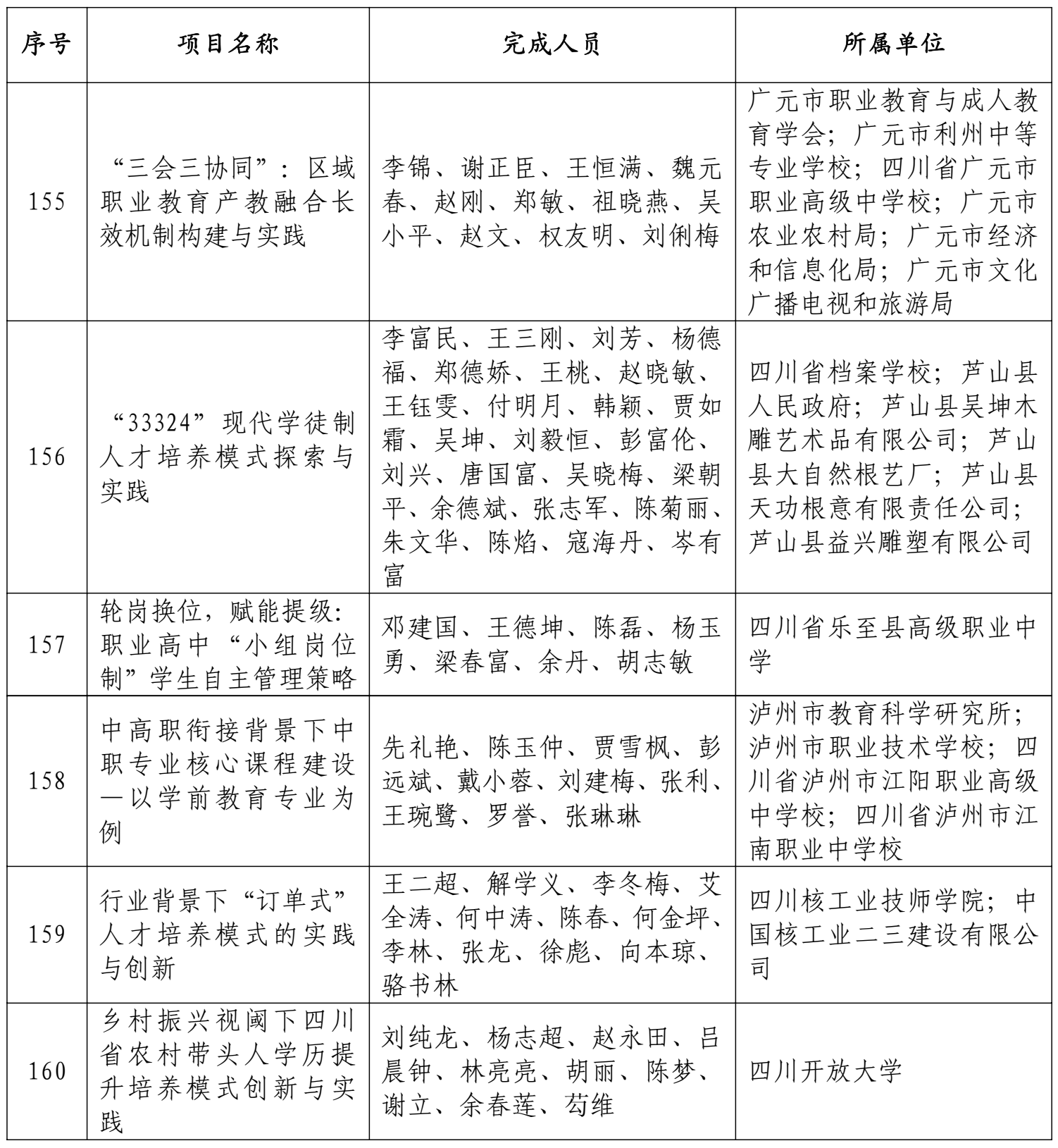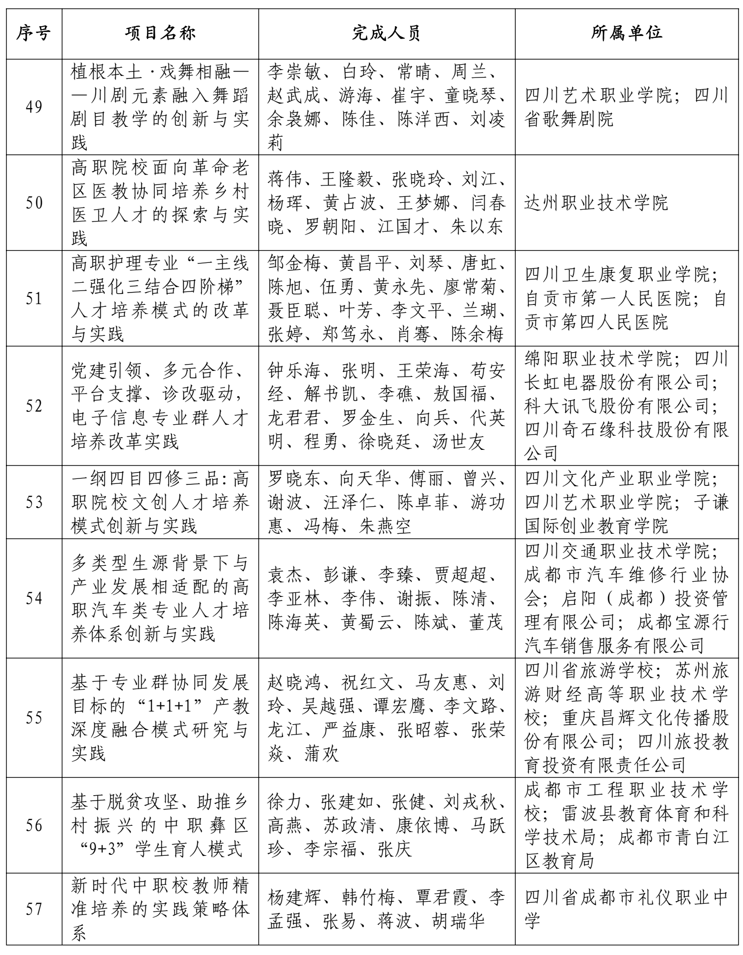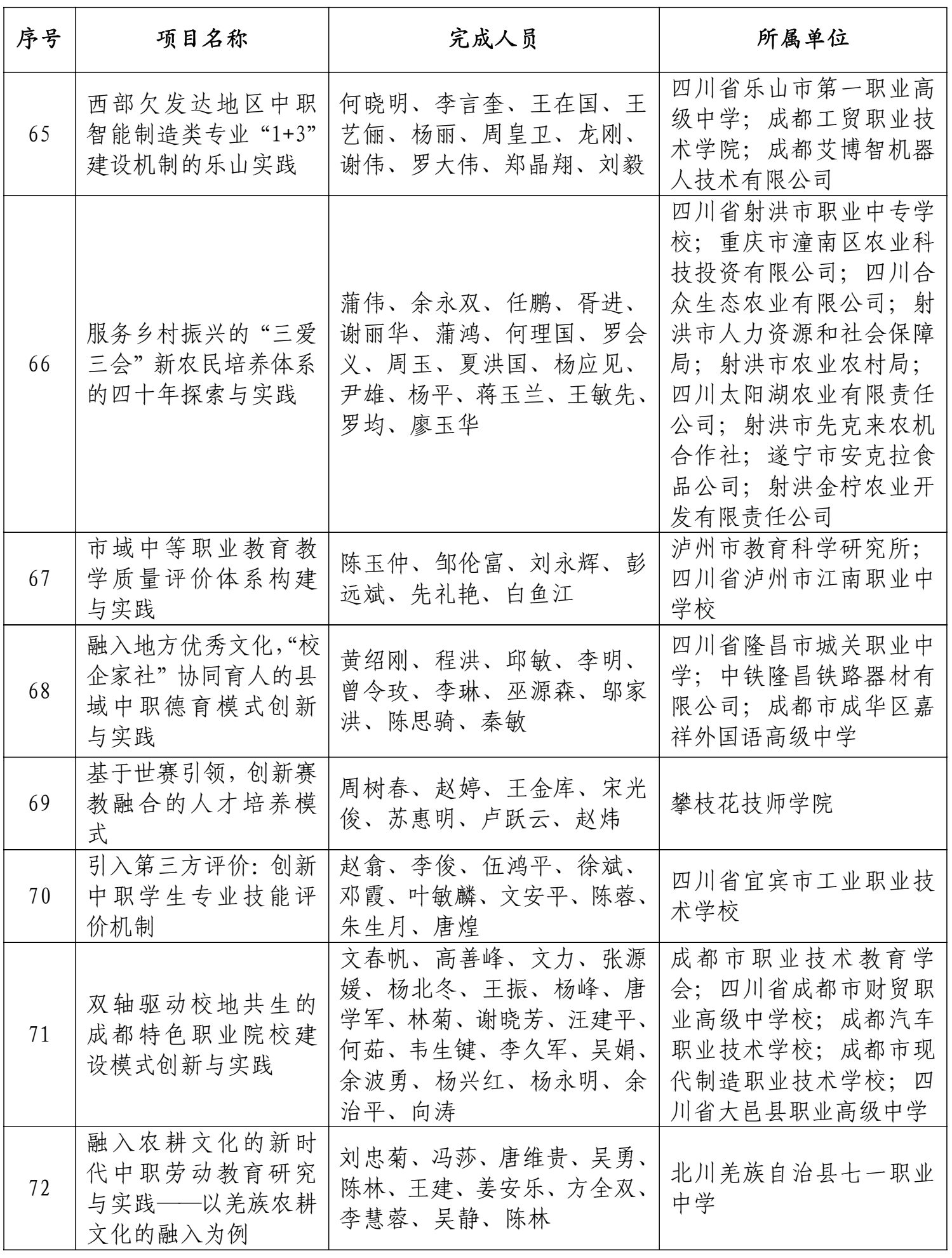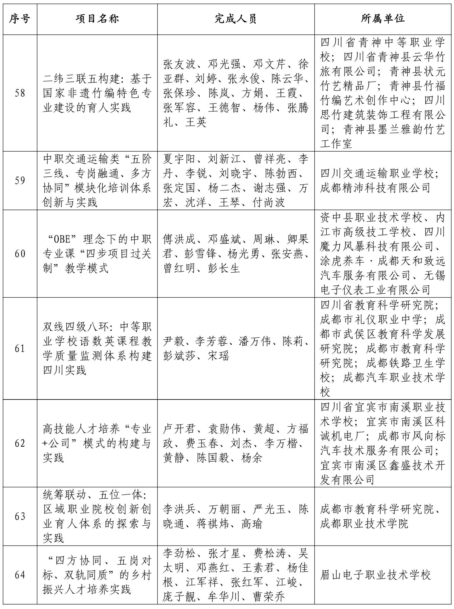 为激励取得教学成果的集体及个人,鼓励教育工作者从事教育教学研究,不断提高教学水平和教育质量,根据《教学成果奖励条例》(中华人民共和国国务院令第151号)和《四川省教学成果奖励办法》(四川省人民政府令第92号)规定,经专家评审、社会公示等规定程序,在基础教育、职业教育、高等教育3个领域共评选出特等奖60项、一等奖260项、二等奖680项。现将获奖名单予以公布。
