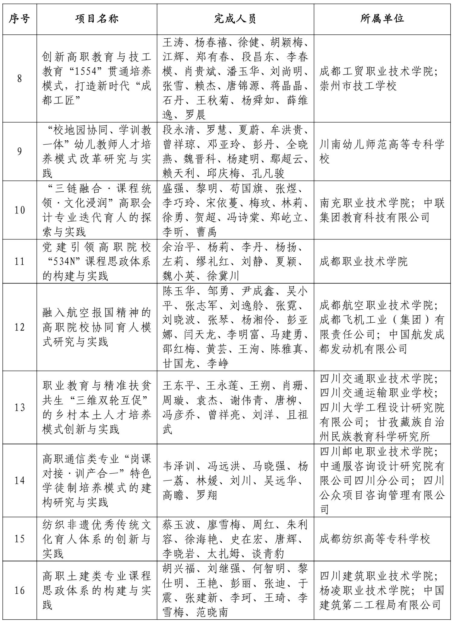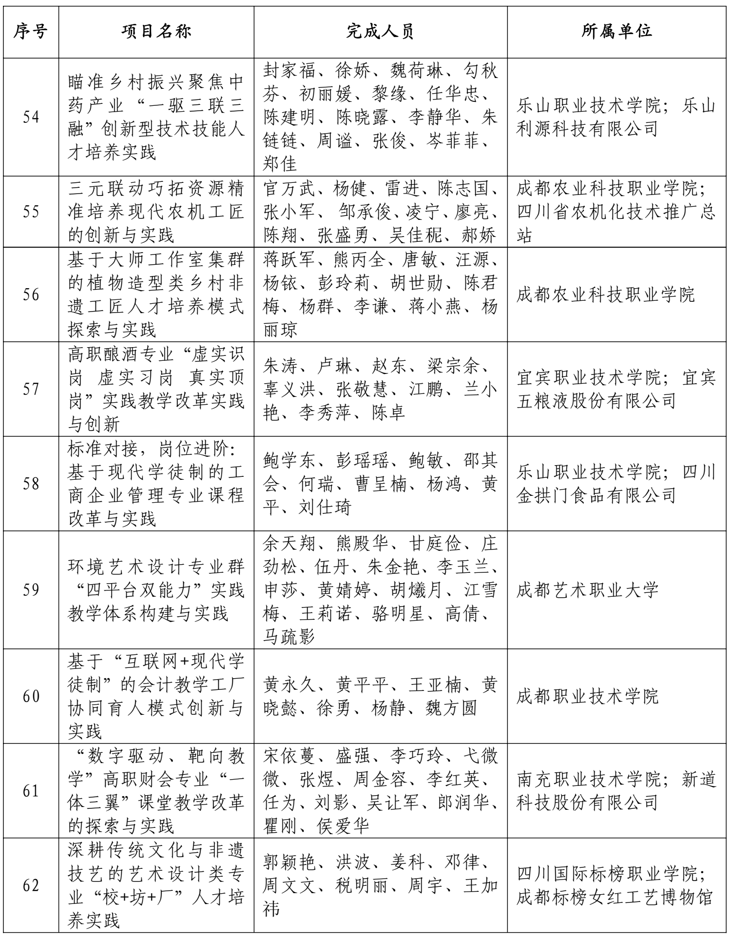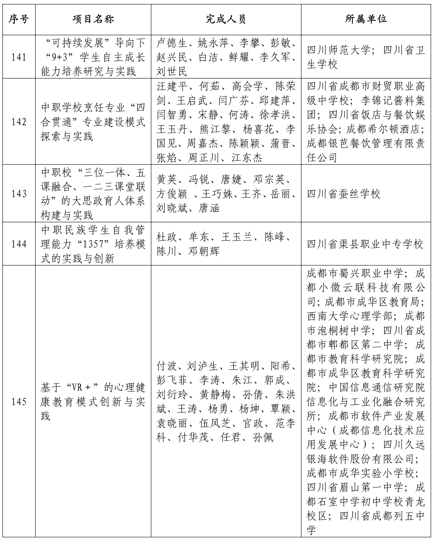 为激励取得教学成果的集体及个人,鼓励教育工作者从事教育教学研究,不断提高教学水平和教育质量,根据《教学成果奖励条例》(中华人民共和国国务院令第151号)和《四川省教学成果奖励办法》(四川省人民政府令第92号)规定,经专家评审、社会公示等规定程序,在基础教育、职业教育、高等教育3个领域共评选出特等奖60项、一等奖260项、二等奖680项。现将获奖名单予以公布。