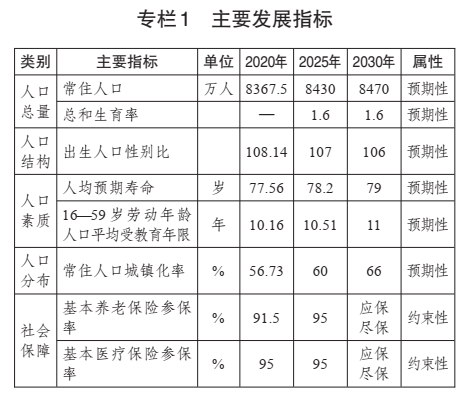 人口总量。总和生育率逐步提升并稳定在适度水平,常住人口规模保持适度稳定增长。到2030年,总和生育率力争达到1.6左右,常住人口达到8470万人左右。