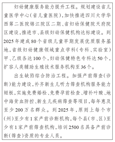 保障孕产妇和儿童健康。实施母婴安全行动提升计划,严格落实妊娠风险筛查与评估、高危孕产妇专案管理、危急重症救治、孕产妇死亡个案报告、约谈通报等母婴安全五项制度。实施妇幼健康保障工程,加强省市县三级妇幼保健机构、综合医院妇产科、儿科服务体系建设,大力提升妇幼保健机构、儿童保健门诊等标准化、规范化建设水平,积极开展孕产期保健、妇女保健、儿童保健等妇幼保健特色专科及亚专科建设。实施健康儿童提升行动,规划建设省儿童医学中心,加强对儿童青少年视力不良、贫血或肥胖等营养不均衡、龋齿、心理行为发育异常等风险因素和疾病的筛查、诊断、干预。继续实施重点地区儿童营养改善等项目。