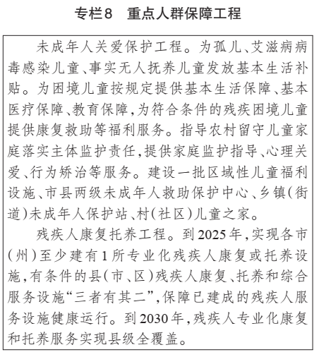 重点人群。城乡居民社会保障体系更加完善,老年人、妇女、儿童、残疾人、低收入人口等群体基本权益得到有效保障,就业创业支持体系更加健全,人民生活水平持续提高。
