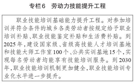 提高劳动力就业创业能力。促进劳动者人力资本积累,完善以就业技能、岗位技能提升和创业为主的培训体系,持续提升企业职工劳动技能和工作效能。全面推行企业新型学徒制,广泛开展定向、定岗培训,增强劳动者技能与用工岗位适配性。加大农业从业人员培训力度,培养高素质现代农业生产经营者队伍,大力提升新生代农民工职业技能,促进农村劳动力转型。健全创业培训、创业实践、咨询指导、跟踪帮扶等一体化创业培训体系,大力培育重点领域创业带头人,鼓励引导大学生、退役军人等重点群体开展创业,完善农民工返乡创业政策支持体系。
