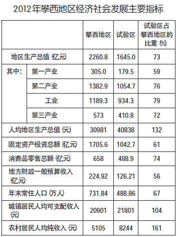 (一)经济社会发展情况。四川攀西地处长江上游川滇黔三省结合部,面积8.2万平方公里,常住人口732万,2012年,实现地区生产总值2260.8亿元,占全省经济总量的9%,是我国重要的水电、新材料、精品钢材和亚热带农业生产基地。其中,试验区人口、生产总值、工业增加值、财政收入分别占67%、73%、79%、56%,是攀西的资源富集地和产业聚集区。