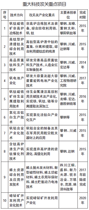 ——扶持重大技术攻关。积极争取国家支持,进一步加大省级财政投入力度,支持重大科技攻关及产业化重点项目,筛选一批核心关键技术攻关项目争取纳入国家相关科技专项。发挥四川省同科技部等的部省合作优势,建立钒钛产业专家指导委员会。加强与中科院及国防军工等有关科研单位合作,推进重大技术攻关和新产品研发。着眼于支持战略性新兴产业发展和国家重大工程,加强钒钛、稀土等应用技术开发。鼓励企业增加研发投入,落实国家鼓励自主创新扶持政策,建设创新型产业区。