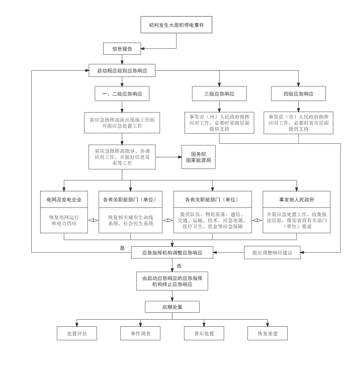 初判发生重大大面积停电事件,由经济和信息化厅报请省政府决定启动二级应急响应,并立即组织召开小组成员和专家组会议,进行分析研判,开展协调应对工作,对事件影响及发展趋势进行综合评估,就有关重大问题做出决策和部署;向各有关单位发布启动相关应急程序的命令,并立即派出工作组赶赴现场开展应急处置工作,将有关情况迅速报告国务院及国家能源局等有关部门。