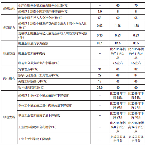规模与质效显著提高。制造业增加值占全部工业比重达到82%;制造业增加值率比2015年提高约2个百分点;制造业全员劳动生产率年均提高7.5%左右;制造业质量竞争力指数达到84.5。