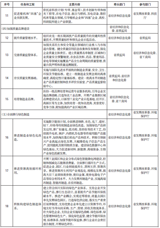 积极构建绿色制造体系。建立符合四川实际的绿色资源开发、绿色资源加工、绿色产业发展的低碳化、一体化绿色产业体系。支持企业开发绿色产品,推行生态设计,显著提升产品节能环保低碳水平。采用绿色工厂标准,改造传统企业和开展新项目建设,实现厂房集约化、原料无害化、生产洁净化、废物资源化、能源低碳化。推进产业耦合,实现近零排放,将重点园区率先发展绿色园区。打造绿色供应链,落实生产者责任延伸制度,支持优势企业率先建立以资源节约、环境友好为导向的采购、生产、营销、回收及物流体系。壮大绿色企业,支持企业实施绿色战略、绿色标准、绿色管理和绿色生产。强化绿色监管,健全节能环保法规、标准体系,加强节能环保监察,推行企业社会责任报告制度,开展绿色评价。