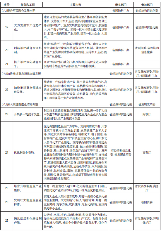 大力发展军工优势产业。建立自主创新的武器装备科研生产体系和创新能力体系,支持在川军工企业、院所承担国家重点型号任务研制和生产,积极布局一批重大军工项目。突破一批军民两用关键技术,创新培育核岛系统集成、航空整机、卫星应用、网络信息安全、智能制造装备、先进信息材料等一大批高新技术产品,重点发展核能与核技术应用、航空航天、军工电子等产业。实施一批军民结合重大建设项目,打造一批高质量产业集群,培育一批大企业、大集团。