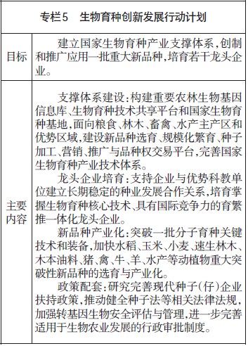 1.提升生物育种核心竞争力。大力开发主要农林动植物的高产、优质、多抗、高效新品种,重点推动水稻、玉米、小麦、大豆、棉花、油菜、马铃薯和猪、禽、牛、羊、水产等动植物重大新品种的培育、扩繁与产业化。加快推进分子育种、细胞育种、航天生物工程、胚胎移植等现代生物技术与常规育种技术的集成应用,加快培育推广超高产、多抗、优质专用、易储耐藏、营养强化等新品种。大力发展果蔬、花草和林木等生物育种高端产业群。发展良种繁育、加工与检测等先进规模化生产装备与技术。推进以企业为主体的国家生物种业品种研发、繁育与示范,规范种子生产、加工、销售与服务平台,建设市场主导的品种权转让交易公共平台,完善育繁推一体化的现代生物种业技术体系。