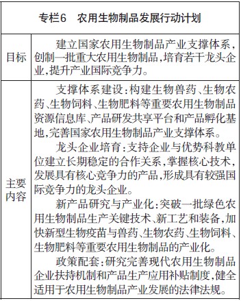 围绕粮食安全、生态改善、农民增收和现代农业发展等重大需求,充分发挥我国丰富的农业生物资源优势,加强生物育种和农用生物制品技术研发能力建设,促进创新资源向企业集聚,加快开展新品种研发、产业化和推广应用,完善质量和安全管理制度,推动生物育种产业加快发展,促进农用生物制品标准化高品质发展。推进海洋生物资源的产业化开发和综合利用。到2015年,生物农业年工业产值达到3000亿元,推广一批新技术与重大新产品,培育一批年产值超百亿元的生物农业企业。