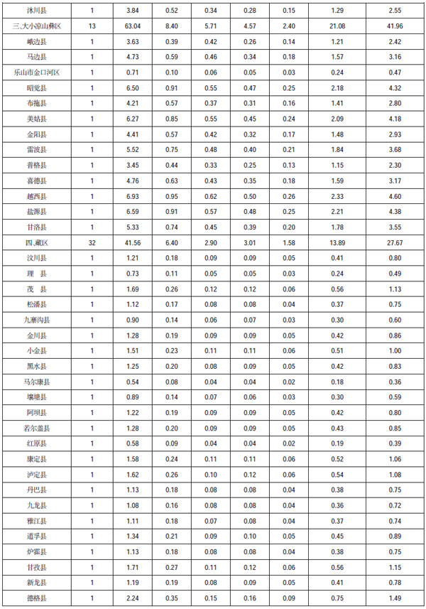 (二)“十三五”阶段减贫任务。“十三五”期间,全省2300元以下扶贫对象总体减少474.87万人,其中“四大片区”县减少340.09万人、片区外县减少134.78万人;秦巴片区32个县减少224.51万人、乌蒙片区9个县减少45.95万人、大小凉山彝区13个县减少41.96万人、四川藏区32个县减少27.67万人,片区外成都平原地区22个县减少13.22万人、丘陵地区47个县减少103.79万人、其他地区21个县减少17.77万人。
