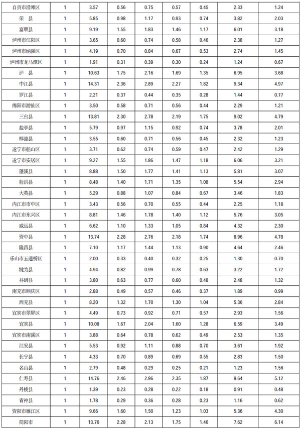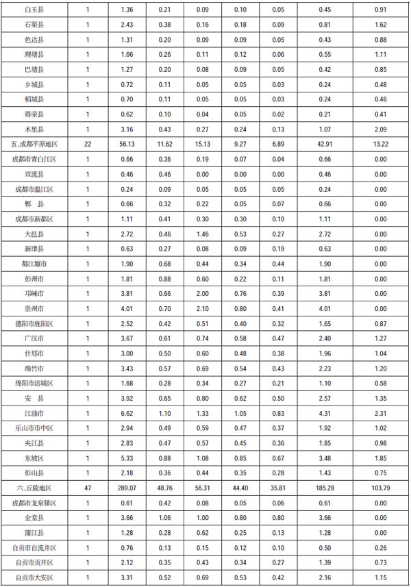 (一)2012—2015年减贫任务。2012年扶贫对象减少140万人,其中《纲要》确定的“四大片区”86个县(以下简称“四大片区”县)减少72.32万人、片区外90个县(以下简称片区外县)减少67.68万人;2013年扶贫对象减少126.49万人,其中“四大片区”县减少47.42万人、片区外县减少79.07万人;2014年扶贫对象减少100.45万人,其中“四大片区”县减少40.61万人、片区外县减少59.84万人;2015年扶贫对象减少70.19万人,其中“四大片区”县减少22.55万人、片区外县减少47.64万人。成都市所辖平原地区和丘陵地区的14个县(市、区)“十二五”期间全面完成2300元以下扶贫对象减贫任务。