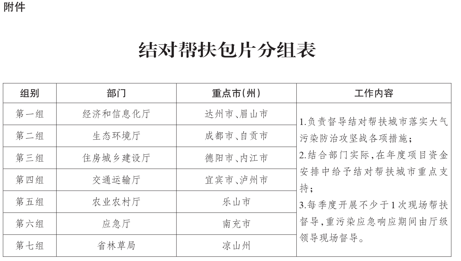 一、开展区域联防联控协作和重点城市结对帮扶。强化区域联防联控协作,由成都、自贡、南充、攀枝花市分别牵头组织成都平原、川南、川东北和攀西经济区定期召开大气污染防治区域联防联控会议。经济和信息化厅、生态环境厅、住房城乡建设厅、交通运输厅、农业农村厅、应急厅、省林草局持续对重点城市开展结对帮扶指导(见附件)。