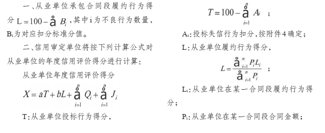 第二十四条 信用评价单位对从业单位承包合同段的履约行为按本办法第二十六条规定进行年度信用评价,并给予合同段年度信用评分。信用审核单位对从业单位承包合同段的履约行为信用评价结果进行审核。信用审定单位根据从业单位在各合同段的年度信用评价进行评分。年度信用等级和信用综合得分计算方法详见附件1。